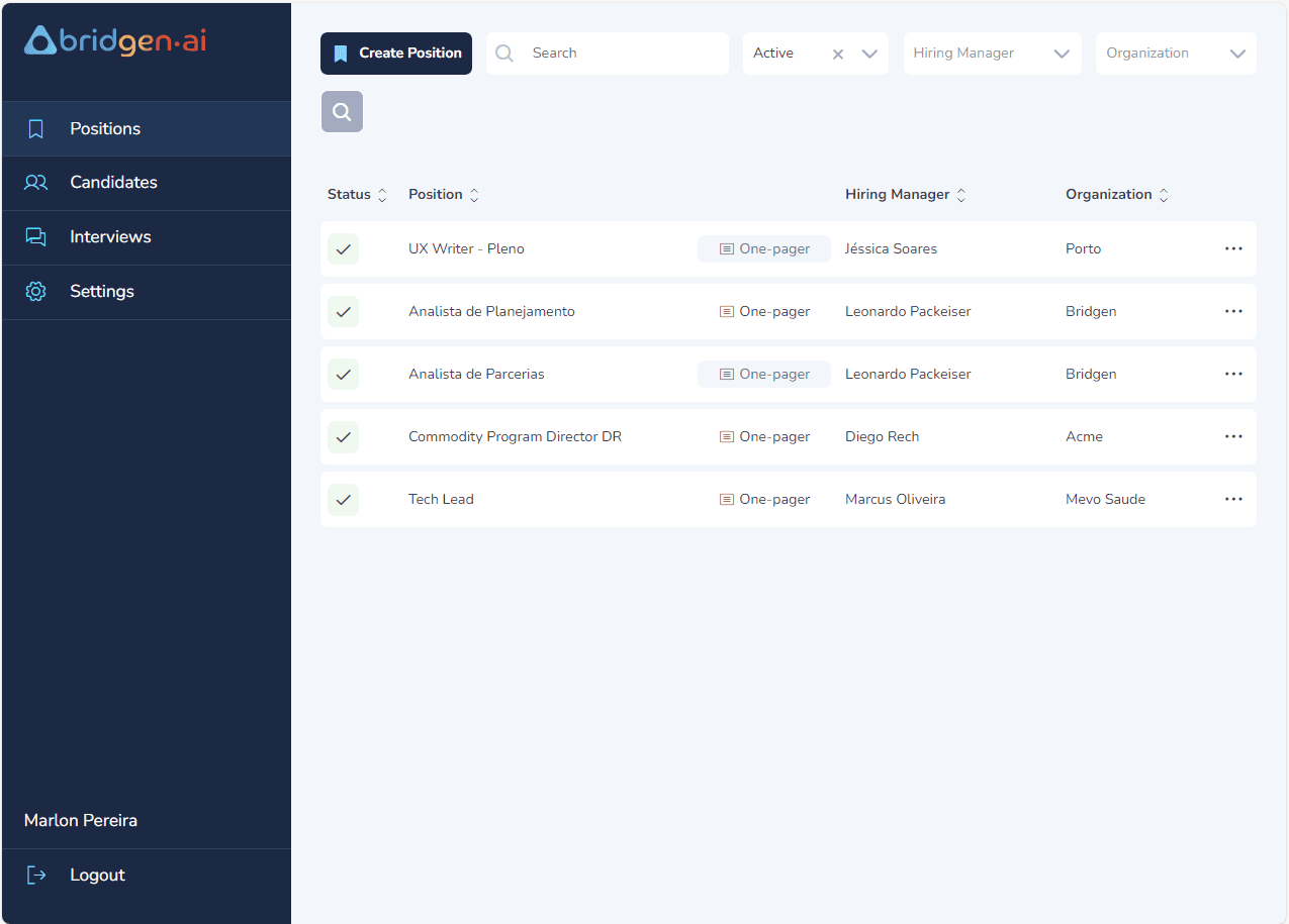 Este usuário gerencia ativamente o processo de contratação:Pode criar cargos, entrevistas e candidatos