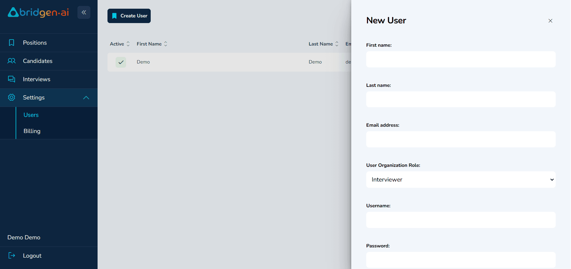 Papel na organização do usuário: Escolha entre Entrevistador, Recrutador, ou Admin (consulte a seção 3.2 para detalhes sobre papéis)
