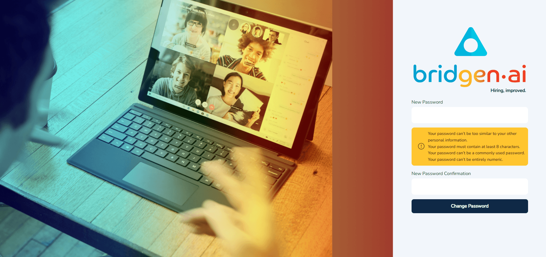 Durante seu primeiro login, você será solicitado a alterar a senha fornecida pela equipe Bridgen para uma senha pessoal (Figura 2). Reinsira a senha fornecida pela equipe Bridgen e defina uma nova senha. Uma senha forte é necessária para prosseguir.